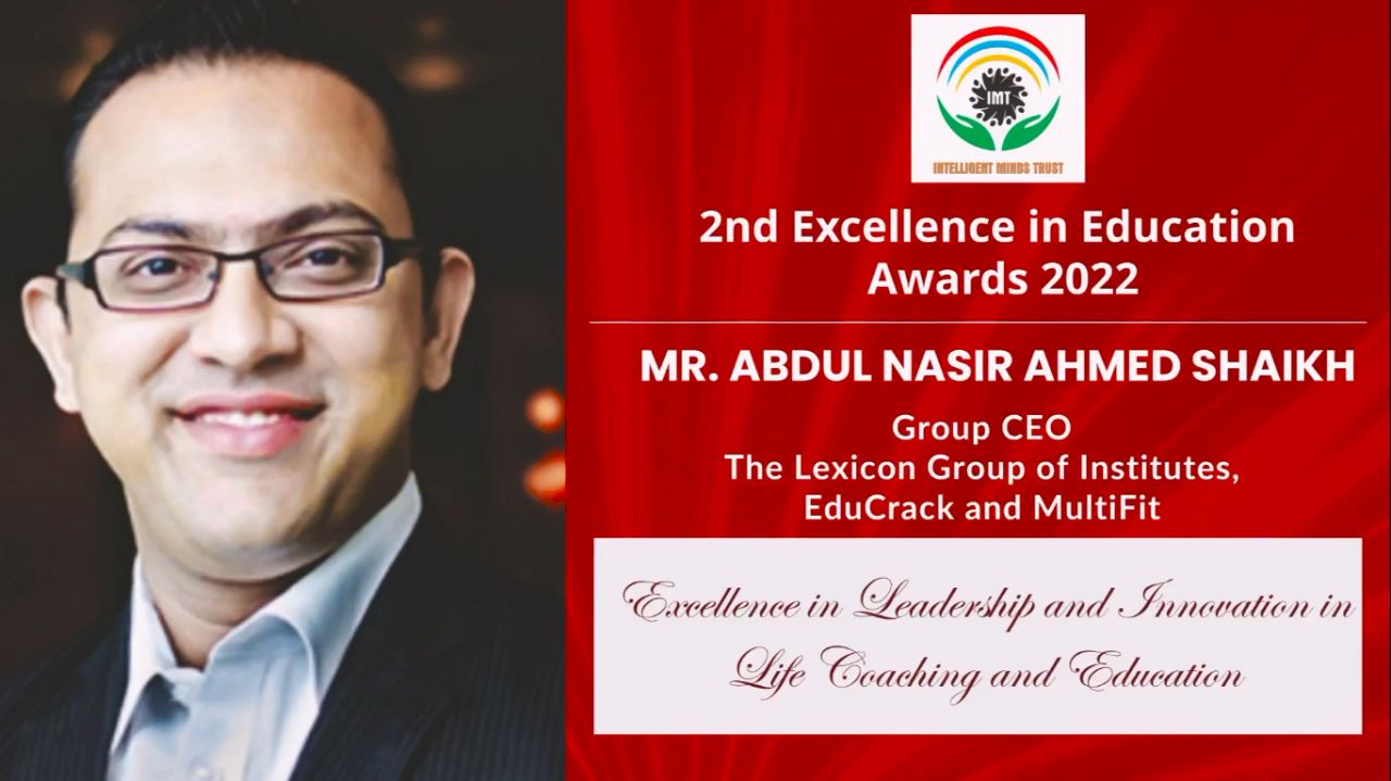 Mr. Abdul Nasir Shaikh, Group CEO - The Lexicon Group of Institutes, EduCrack & Easy Recruit+, Associate Editor - Pune Times Mirror & Civic Mirror, is recognized for Excellence in Leadership and Innovation in Life Coaching and Education by Intelligent Minds Trust.