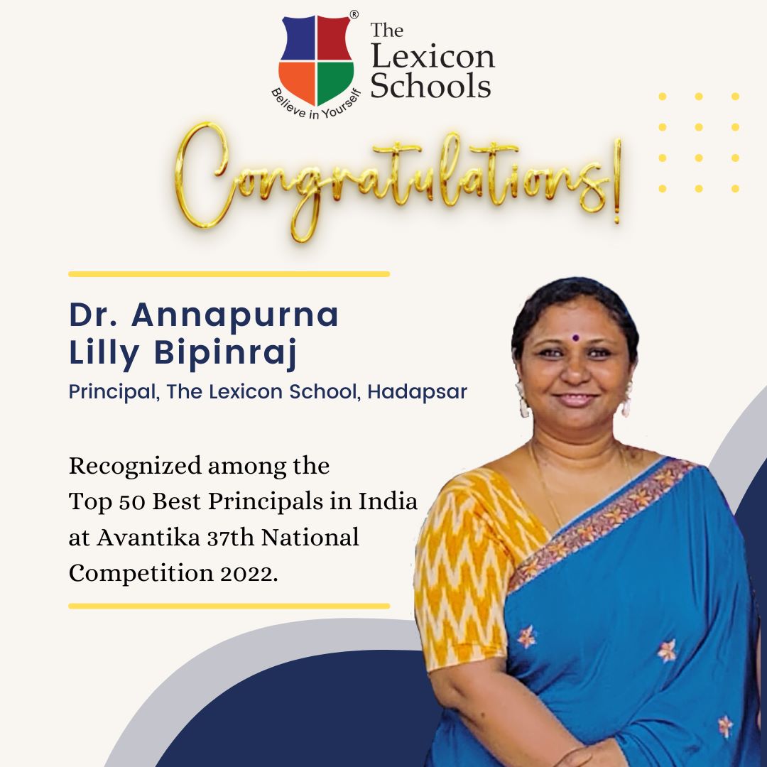 Dr. AnnapurnaLilly Bipinraj, Principal, The Lexicon School, Hadapsar was among the Top 50 in the Best Principals in India at the Avantika 37th National Competition 2022.